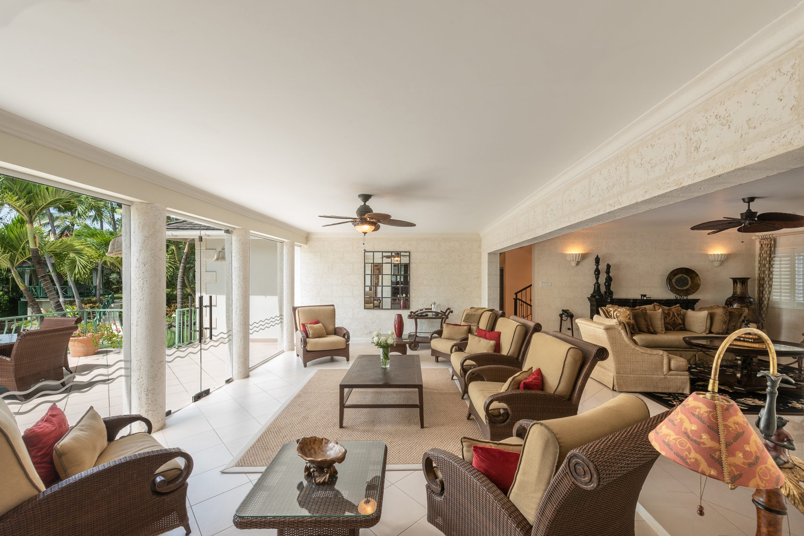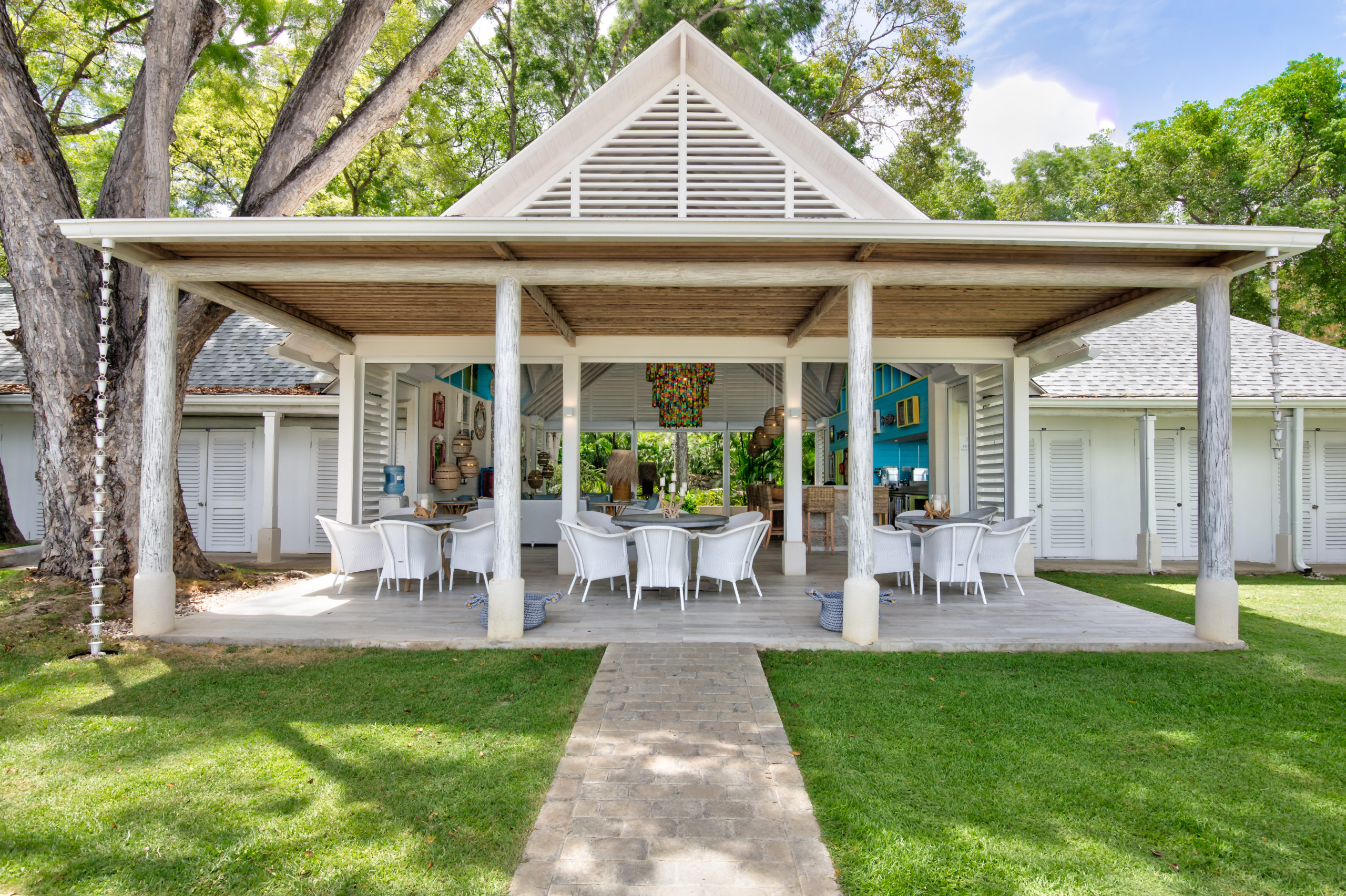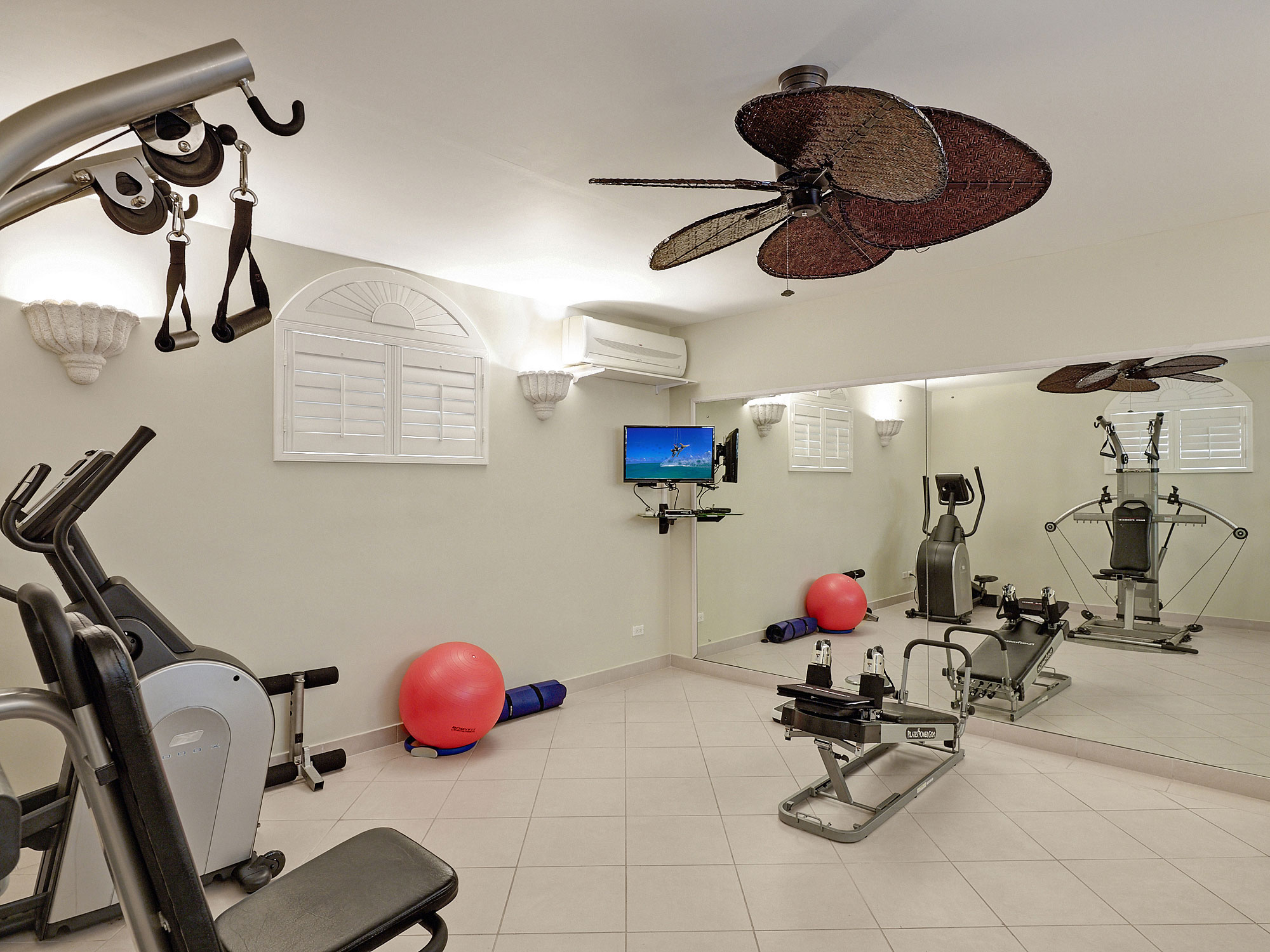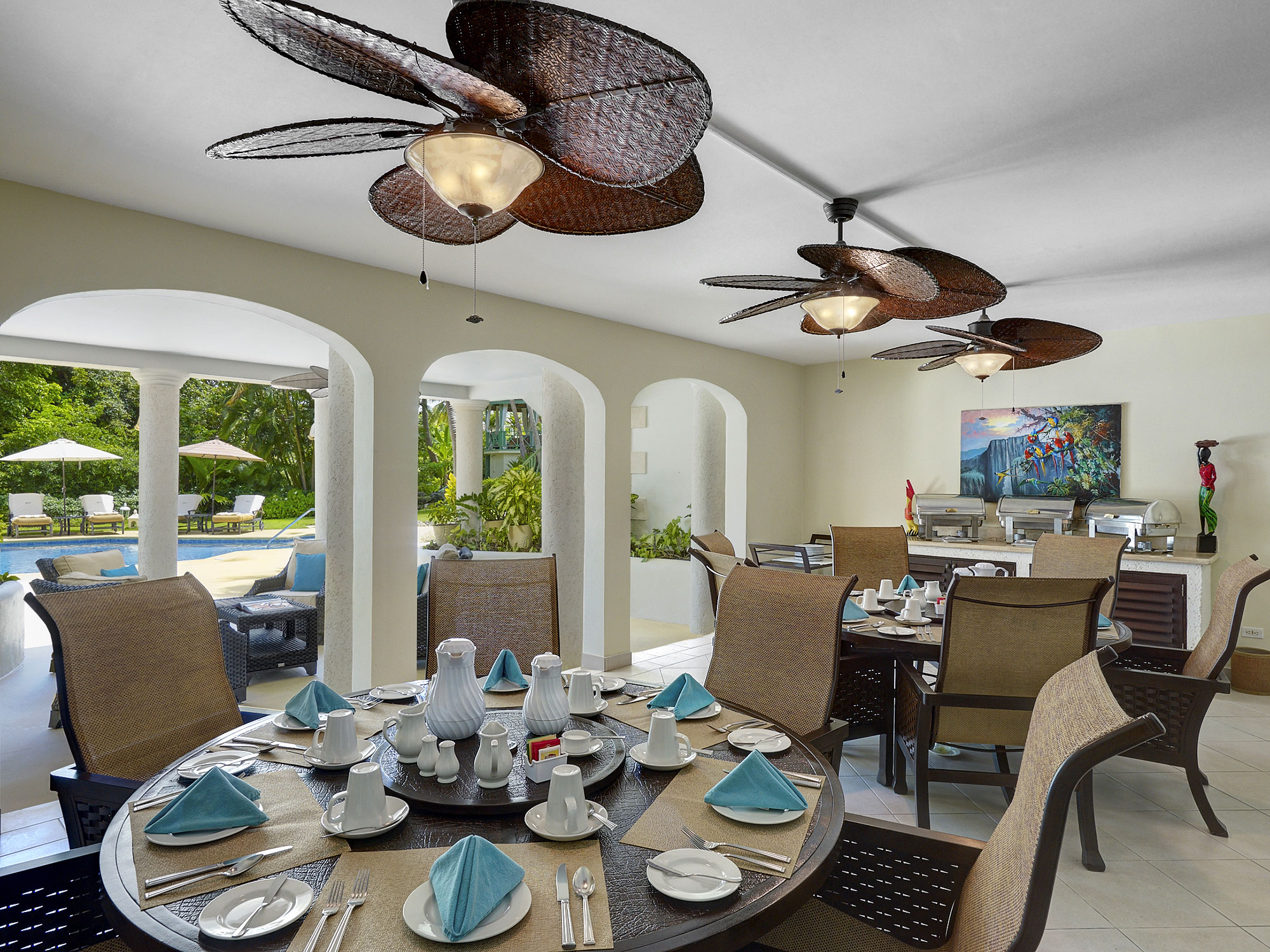 Large French doors open directly onto the lush garden terrace, allowing natural light to flood the room and offering seamless indoor/outdoor living. Whether you’re perfecting your shot over a casual game of pool, enjoying a drink at the high-top bar, or simply soaking in the tranquil garden views, this sophisticated setting is designed for leisure and connection in true Caribbean style.